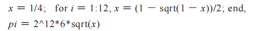上面的代码是从六边形开始,加倍12次后精确 π到小数点后第7位。