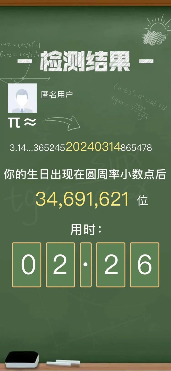 如下图,“2024年3月14日”就出现在圆周率小数点后的第34691621位。