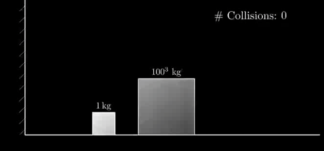 可以通过碰撞得到小物块与大物块的碰撞总次数为0.5πN1/2(N为大物块与小物块质量比),同时小物块与墙也会碰撞0.5πN1/2,当N等于100的幂次方倍时,碰撞次数就能得出圆周率了!