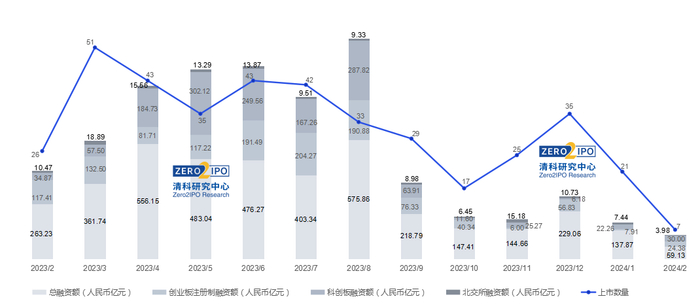 根据清科创业(01945.HK)旗下清科研究中心数据,2024年2月共有7家中国企业【1】在境内外交易所成功上市,总融资额约59.13亿人民币。其中境内上市中企共6家。受春节假期影响,数量较上月的14家有大幅下降,总融资额约58.36亿人民币。本月半导体及电子设备行业上市数量共4家居首位。诺瓦星云登陆深交所创业板,融资额达16.29亿人民币,成为本月单笔融资额最高的上市中企。