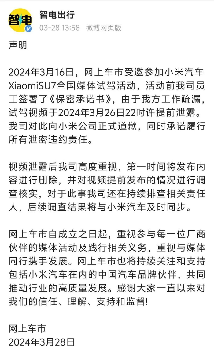 3月28日,网上车市发布致歉声明:2024年3月16日,网上车市受邀参加小米汽车XiaomiSU7全国媒体试驾活动,活动前我司员工签署了《保密承诺书》,由于我方工作疏漏,试驾视频于2024年3月26日22时许提前泄露。我司对此向小米公司正式道歉,同时承诺履行所有泄密违约责任。视频泄露后我司高度重视,第一时间将发布内容进行删除,并对视频提前发布的情况进行调查核实,对于此事我司还在持续排查相关责任人,后续调查结果将与小米汽车及时同步。