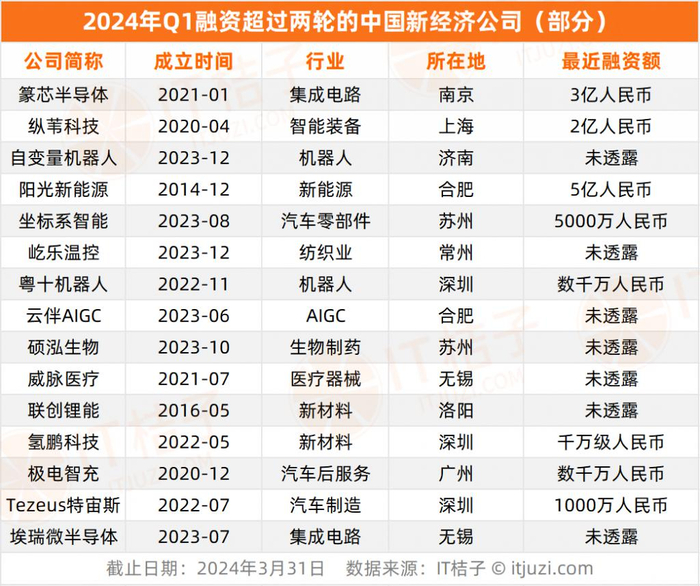 Q1 季度,获得了 10 亿元以上融资的国内企业有 20 家,包括宇树科技、熙泰科技、博泰车联网等,具体名单如下表所示。