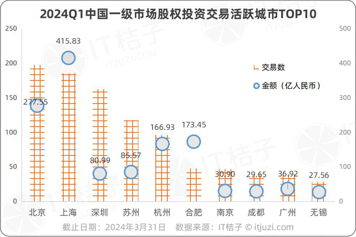 在投资金额上,上海的创业企业在 2024 年 Q1 获得了最多的融资额,达到了 415.83 亿元,远远超过了北京。上海地区本季度备受瞩目的融资明星公司包括智己汽车的 80 亿元融资、垣信卫星的 67 亿元融资、长电科技汽车电子的 44 亿元融资等。