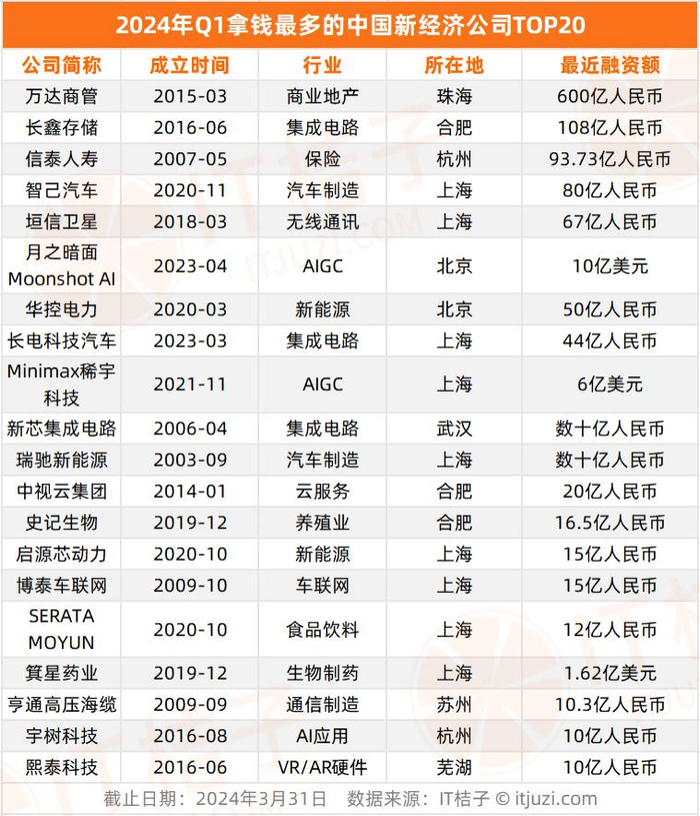 合肥、杭州的创业公司一季度融资额也超过了 100 亿元,其中高额融资的主要获得者是落户合肥的存储芯片独角兽「长鑫存储」在 2024 年宣布获战略融资 108 亿元;以及总部位于杭州的综合性保险企业「信泰人寿」在年初引入了新的战投—— 4 家浙江国资企业,共增资 93.73 亿元,并新增注册资本约 52.04 亿元。