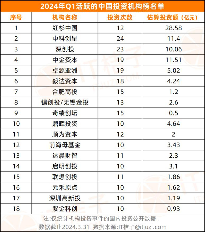 IT 桔子数据显示,从投资出手次数看,中科创星是 2024 年 Q1 季度国内活跃投资机构的榜首,深创投居第二位,中金资本、卓源亚洲跃居活跃榜前五名。