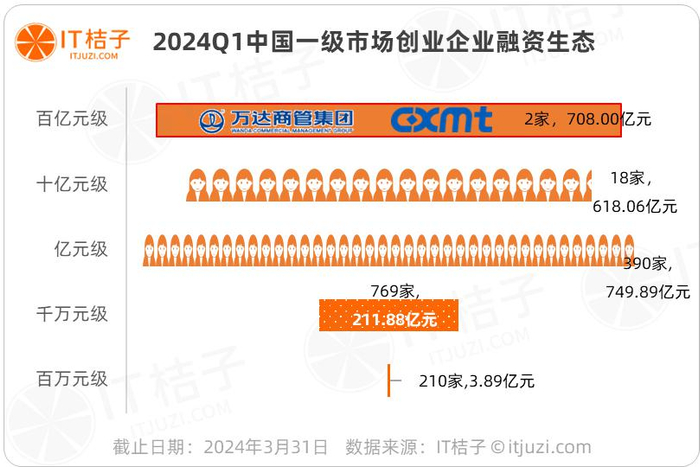 单笔融资百亿元级的仅有 2 家创业公司:万达商管拿下了 600 亿元,长鑫存储融资 108 亿元;2 家公司占据了整个份额的 31%。单笔融资不足亿元的近千家创业公司仅分享了融资蛋糕中的不到 10%。