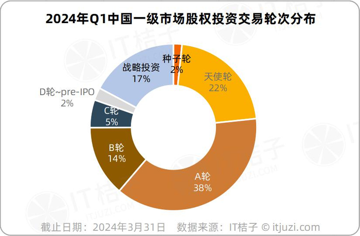 从 2024 年第一季度中国一级市场不同轮次股权投资的分布情况来看,A 轮融资以 38% 的比例领先,显示出市场对初创企业的高度关注和支持。天使轮的占比也相对较高,达到 22%,这表明风险投资者愿意在企业成长的早期阶段进行投资。「投早、投小」的号召在市场上有了直接的反应。