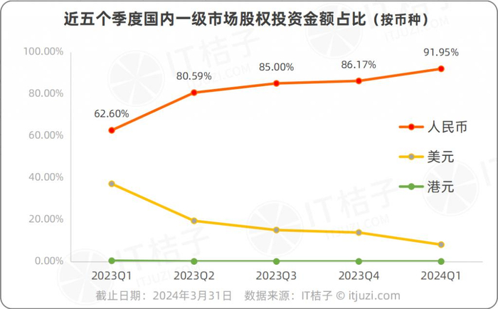 2023 年 Q1,国内美元投资金额占比为 37.06%,在随后的几个季度中,美元投资金额占比持续下降,从 2023 年第二季度的 19.39% 逐渐减少至 2024 年 Q1 的 8.04%。港元投资则始终极少,零星有几起。