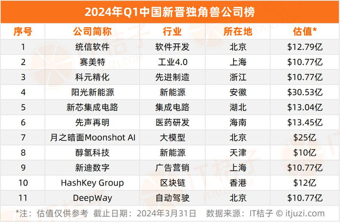 在 2024 年 Q1,有 11 家国内创业公司晋级为独角兽,成为估值达到 10 亿美元 + 的明星公司,如大模型公司月之暗面 Moonshot AI,其开发的产品为 AI 聊天助手 Kimi;光伏上市公司「阳光电源」分拆出的阳光新能源。