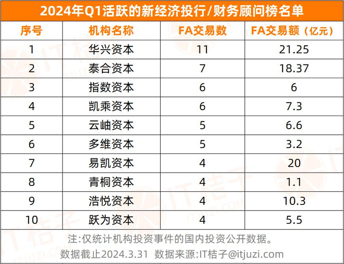 2024 年 Q1 活跃的新经济投行 / 财务顾问榜第一名是华兴资本,撮合的交易数有 11 笔,帮助创业企业融资 21.25 亿元,这两项指标均遥遥领先。