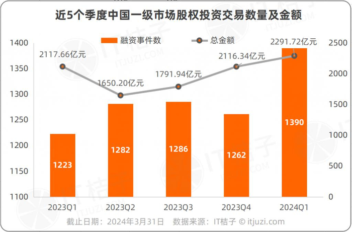 2024 年 Q1,国内一级市场股权投融资事件数有 1390 起,环比增长 10%,同比增长了 14%;估算投资总额约 2291.72 亿元,环比、同比均增长 8%。
