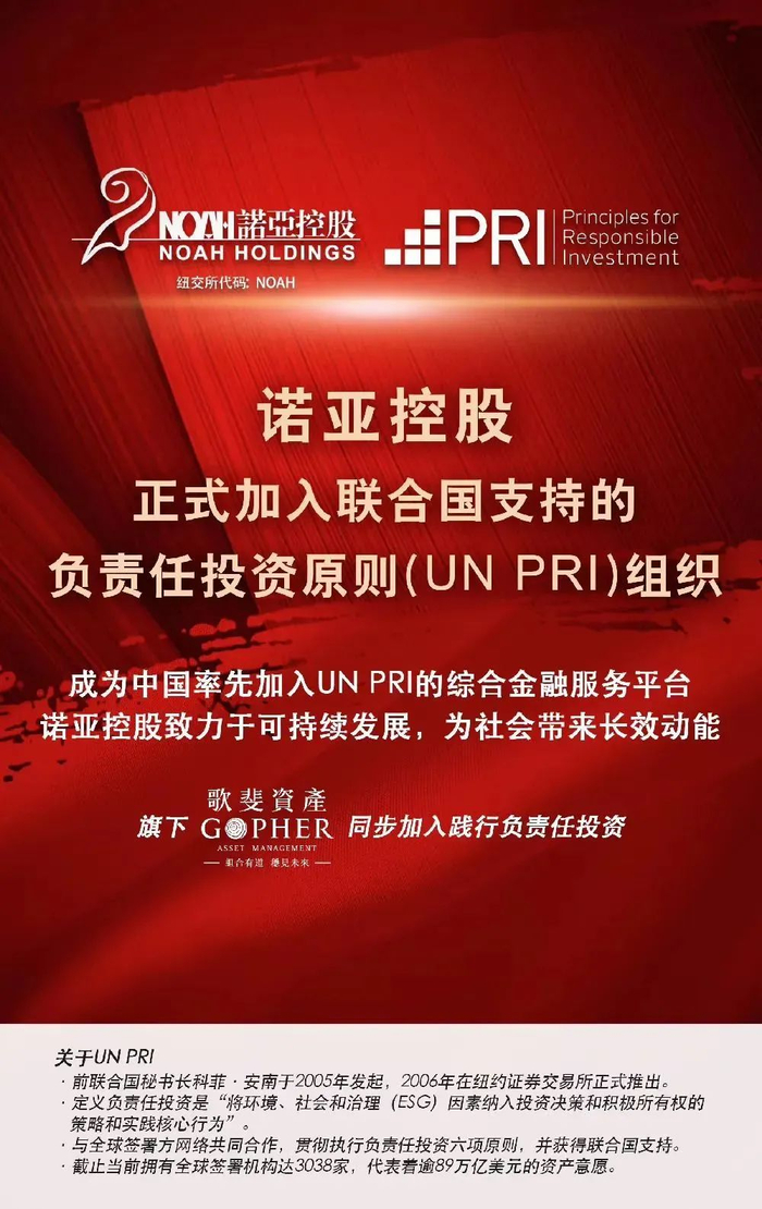 诺亚一直在多角度深度投注ESG,以善尽社会责任,实现可持续经营。2020年5月,诺亚控股及旗下歌斐资产双双成为联合国支持的负责任投资原则组织(UN Supported Principles for Responsible Investment,简称“PRI”)签署机构,成为率先参与该计划的中国综合金融服务机构。2021年6月,诺亚财富在海内外公募基金平台微笑基金与iNoah推出ESG基金精选专区,使得个人投资者在追求投资回报的同时,更能彰显投资者主动履行社会责任,与社会共享可持续发展成果的投资情怀。