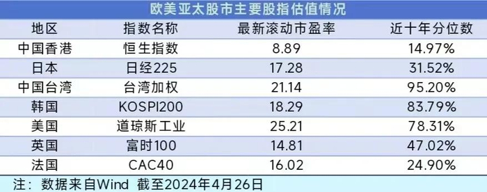亚太市场方面,日经225指数滚动市盈率为17.28倍,处于近十年31.52%分位;台湾加权指数滚动市盈率为21.14倍,处于近十年95.2%分位;韩国KOSPI200指数滚动市盈率18.29倍,处于近十年83.79%分位。