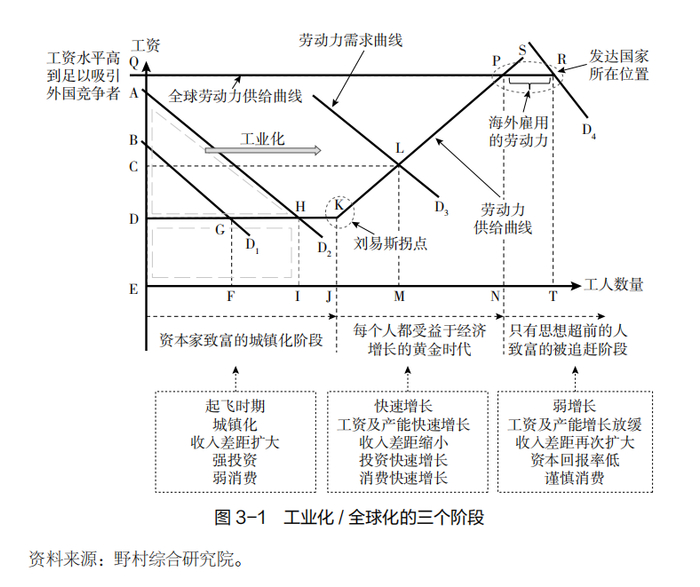 为理解这些因素如何随着时间改变,根据不同的工业化程度,“被追赶的经济体”这一概念将经济体划分为三个阶段:即刘易斯拐点前的城镇化阶段、跨越刘易斯拐点的黄金时代和被追赶的阶段。(注:刘易斯拐点指的是特定时点,在该时点城镇工厂已完成对全部农村剩余劳动力的吸收)