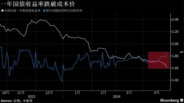中债估值数据显示,1年期国债收益率今年累计下行逾40个基点,4月以来已经连续多个交易日和银行间隔夜及7天期质押式回购利率倒挂。这一情况并不常见。