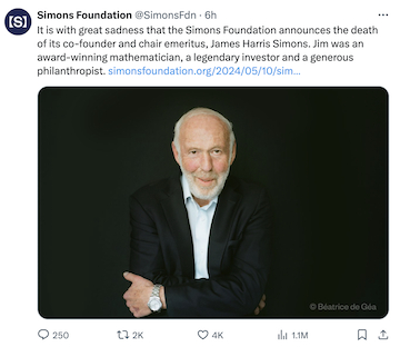 基金会表示,吉姆是一位屡获殊荣的数学家、传奇投资家和慷慨的慈善家。