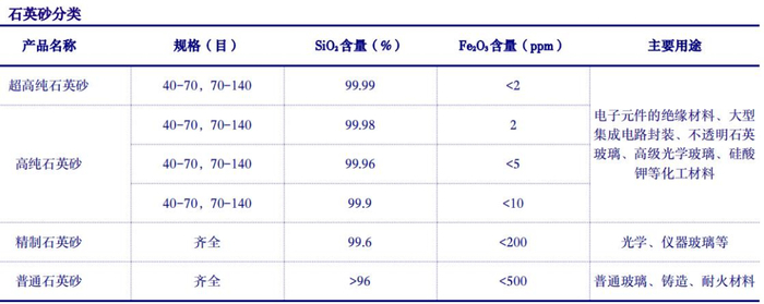 石英是无机非金属矿物,主要成分是二氧化硅,是水晶、玛瑙、河沙、硅石等的主要矿物成分,一般为无色或乳白色,质地坚硬,常含有少量杂质成分,如铝、钾、钠、锂等。石英砂是石英石经粉碎、筛选、酸洗、水洗、煅烧等工序制成的石英颗粒,我国一般通过石英砂的二氧化硅及氧化铁含量的不同对其进行细分,主要分为普通石英砂、精制石英砂、高纯石英砂和超高纯石英砂。