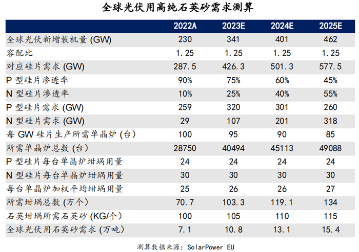 全球高纯石英砂供应企业较少,光伏用高纯石英砂呈供需紧平衡状态。海外方面,目前美国矽比科和挪威 TQC 光伏用高纯石英砂供给量合计约 2.5 万吨/年,TQC 近年暂无高纯石英砂扩产计划,矽比科 2023 年 4 月宣布 2023-2025 年期间将通过提高工艺效率逐步扩大产量,预计将新增 1.3 万吨高纯石英砂,考虑到技术升级需要一定的时间周期,预计新增产能主要在2025 年释放。国内方面,2023Q1 石英股份产能达 3 万吨/年,随着后续年产 6 万吨高纯石英砂新增产能的释放,石英股份高纯石英砂产量将增加;此外,合成石英砂技术突破后,国内其他高纯石英砂企业产量也有望小幅增长。预计 2023-2025 年全球高纯石英砂供给量将达到6.9/10.4/13.4 万吨,对应供需平衡约-3.9/-2.7/-2.0 万吨,光伏用高纯石英砂将延续供需偏紧态势。