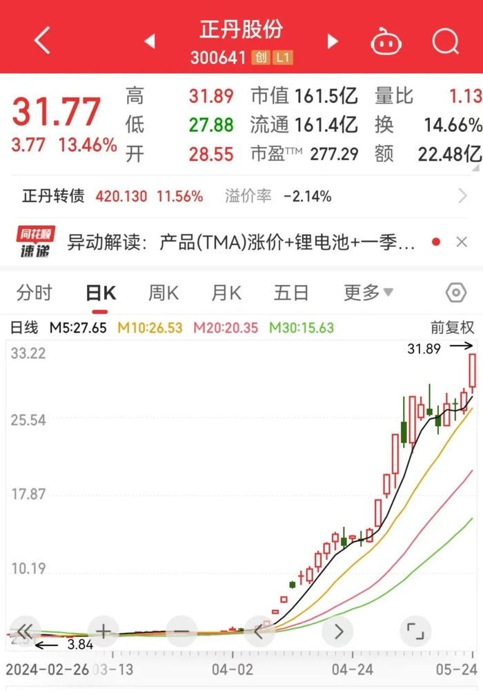 截至今天收盘,正丹股份涨13.46%,报31.77元/股,较2月7日低点2.83元涨幅超1000%。