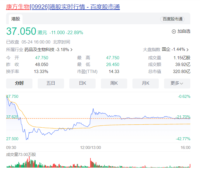 受此影响,午后康方生物股价跌幅大幅收窄。截至收盘,康方生物股价跌22.89%,报37.05港元/股。