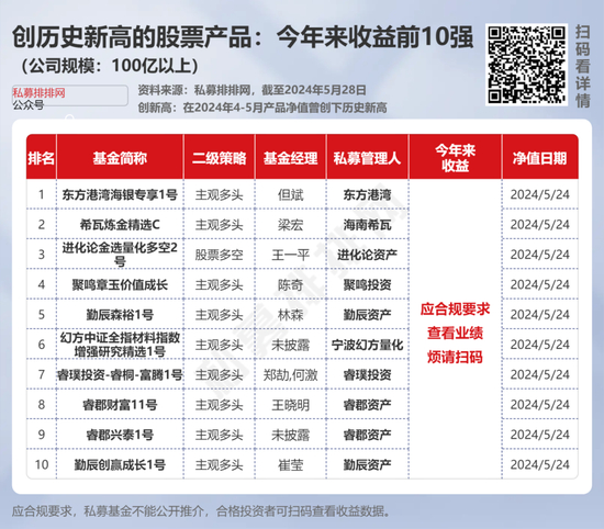 截至5月28日,二季度来净值创历史新高的百亿私募股票产品,今年来收益前10强的上榜“门槛”接近***%(点此蓝字查看收益)。细分策略来看,10强产品中,主观多头产品占9只,股票多空产品占1只。