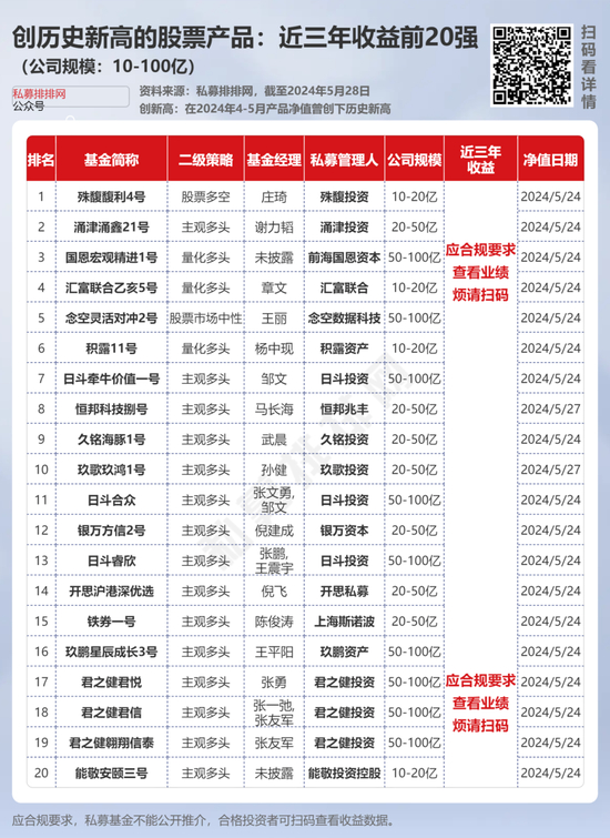 为了给读者提供更好的参考,笔者从创新高的股票策略私募产品中,分别梳理出了百亿私募旗下今年来、近三年收益居前10的产品;10-100亿规模私募旗下今年来、近三年收益居前20的产品。(同一基金经理旗下产品选业绩较高的;剔除净值不足0.8的)