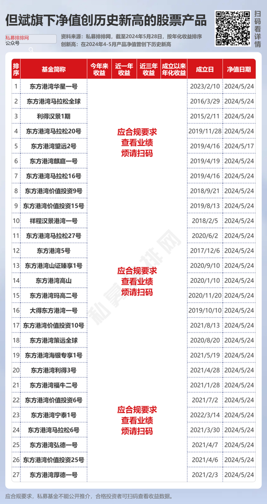 此外,值得一提的是,在71只创新高的股票策略私募产品中,东方港湾占27只,均属于但斌管理。其中,成立于2016年的“东方港湾马拉松全球”和成立于2015年“利得汉景1期”两只老牌产品均在列,且年化收益均在***%(点此蓝字查看收益)以上。