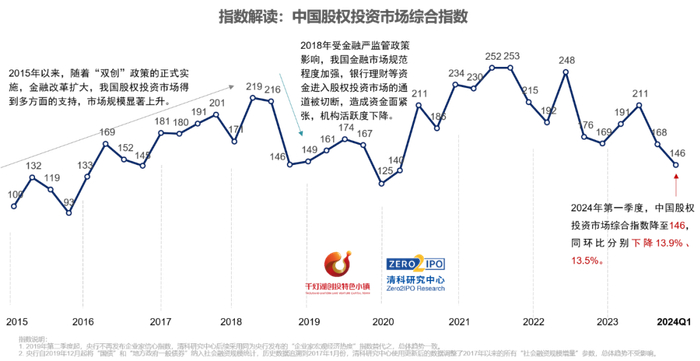 2024年第一季度,中国股权投资市场综合指数为146,同环比分别下降13.9%、13.5%,全市场活跃度处于近三年低位。