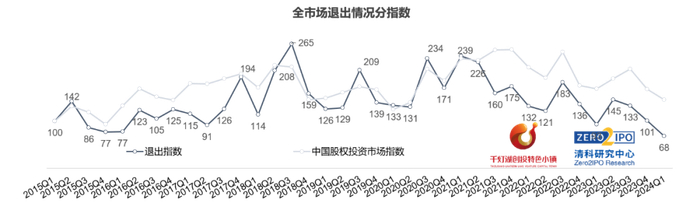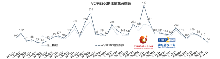 2024年第一季度,中国VC/PE 100退出分指数为64,同环比分别下降37.4%、41.5%,降幅分别为市场整体的1.4倍、1.3倍,头部机构退出活跃度处于历史低位。