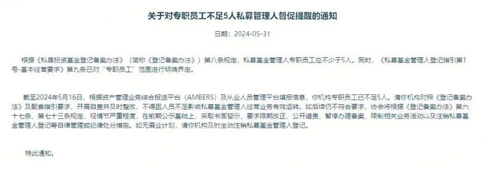 中基协统计了截至2024年5月16日,在AMBERS系统及从业人员管理平台填报的专职员工不足5人的私募管理人信息,要求管理人对照《登记备案办法》及配套指引要求,开展自查并及时整改,不得因人员不足影响私募基金管理人经营业务有效运转。如后续仍不符合要求,协会将根据《登记备案办法》相关规定,视情节严重程度,在前期公示基础上,采取书面警示、要求限期改正、公开谴责、暂停办理备案、限制相关业务活动以及注销私募基金管理人登记等自律管理或纪律处分措施。