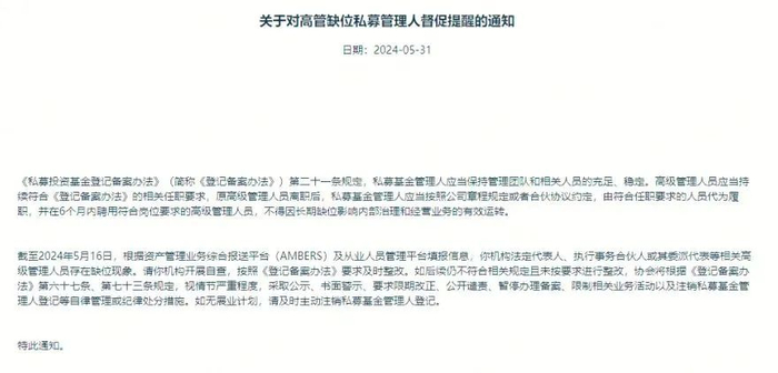 在另一份《关于对高管缺位私募管理人督促提醒的通知》中,中基协指出,《私募投资基金登记备案办法》第二十一条规定,私募基金管理人应当保持管理团队和相关人员的充足、稳定。高级管理人员应当持续符合《登记备案办法》的相关任职要求,原高级管理人员离职后,私募基金管理人应当按照公司章程规定或者合伙协议约定,由符合任职要求的人员代为履职,并在6个月内聘用符合岗位要求的高级管理人员,不得因长期缺位影响内部治理和经营业务的有效运转。
