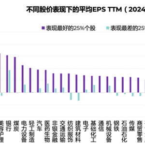 基于同样的逻辑看2024年的结果。除了有色和军工,剩余的29个行业中,股价表现最好的股票在EPS上全面超越股价表现靠后的股票。这说明基本面因素在股票定价中的影响力获得了明显回升。