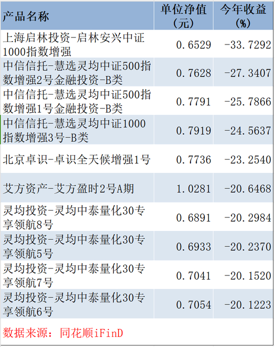从具体产品来看,百亿量化私募头部产品和尾部阵营的业绩分化仍在加大,上述提到的鸣石傲华九号今年以来收益已攀升至63.12%,而上海启林投资旗下启林安兴中证1000指数增强跌幅仍超33%,首尾产品业绩差已高达96个百分点。