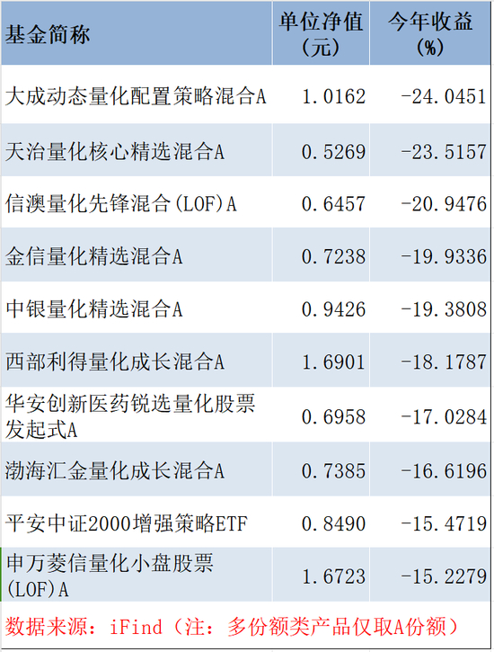今年以来公募量化“黑榜”方面,TOP10产品跌幅也是稍微放大,且名单变动不大。大成动态量化配置策略混合A依旧垫底,今年以来跌幅超24%;此外,天治量化核心精选混合A和信澳量化先锋混合(LOF)A也跌超20%,有加速“沉底”的迹象。值得一提的是,截至5月底,今年以来“黑榜”TOP10产品跌幅均超15%,其中不乏去年表现较好的产品,如2023年度公募量化冠军渤海汇金量化成长混合A。