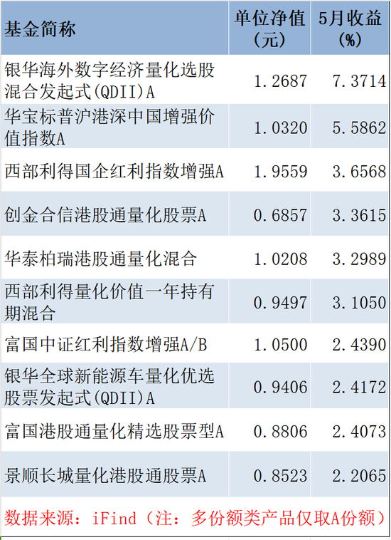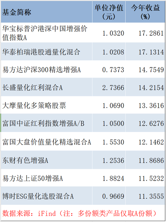 从今年前5个月来看,公募量化整体业绩虽受5月的挑战冲击,但头部产品收益却并未出现明显下滑,反而有一定程度地抬升。其中,华宝标普沪港深中国增强价值指数A和华泰柏瑞港股通量化混合齐头并进,今年以来收益均超17%;4月底登顶榜首的易方达沪深300精选增强A小幅下滑,前5个月涨幅为14.75%,位列第三;此外,长盛量化红利混合A也涨超14%,今年以来“红榜”TOP10产品涨幅均超11.35%,也相比4月底小有抬升。