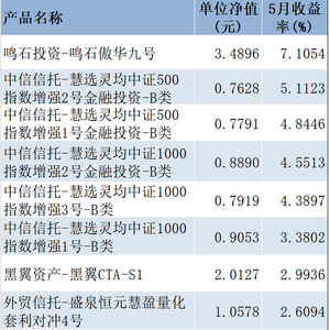 百亿量化私募方面,5月有超半数产品逆势赚钱,整体超额表现也终于出现回暖。在中证500和中证1000指数均跌超2%的背景下,1300多只产品中跑输这两大主流宽基指数仅个位数,这也说明量化私募正在切换以前偏中小盘风格的策略。