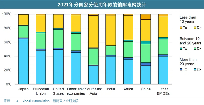 根据IEA的统计,2021年欧美日等发达国家输配电网已有超过半数在20年以上,中国等发展中国家这一比例明显下降。当前的电力设备更换需求更多的存在于第二次工业革命以来的老牌发达国家,而发展中国家更多对应的是新增需求。