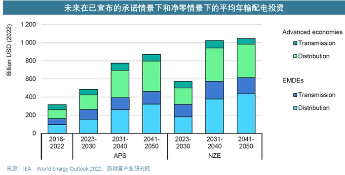 根据IEA的数据,2016-2022年全球输配电的年平均投资在3000亿美元以上,在已宣布的承诺情景下,2023-2030年全球输配电的年平均投资将达到5000亿美元,2030年当年的投资或将超过6000亿美元,是当前的两倍以上。2030年后,输配电的投资将再次加速,2031-2040年年均投资将达到7750亿美元。
