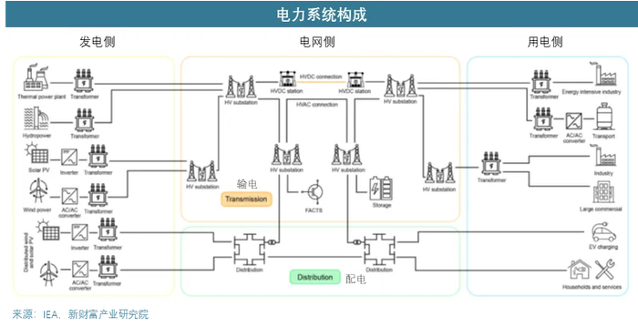 电力系统的构成可以分为发电侧、电网侧和用电侧三个方面:
