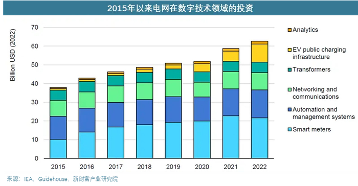 随着可再生能源分布式发电的渗透率提高,电网内能源流动方向变得不可预测,这需要部署新的数字技术。发达国家对智能电表的替换需求以及发展中国家对智能电表的新增需求由来于此。根据IEA的数据,近年全球对智能电表(Smart meters)的投资额处于稳步增长阶段,智能电表在电网投资中属于配电侧。