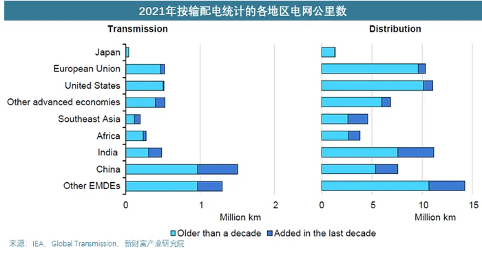 根据IEA的数据,过去十年中,我国输电电网公里数的增长在全球占首要地位,而欧美日这类老牌国家输电增长十分缓慢。配电方面,我国稍落后于印度和东南亚地区,但依然领先于老牌发达国家。