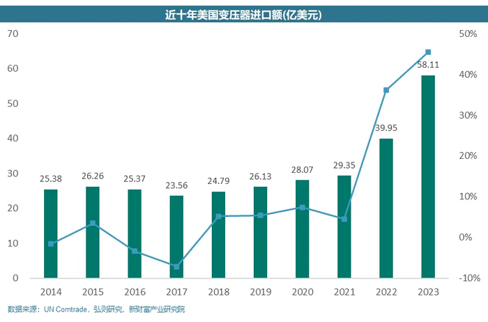该事件当时引起了广泛的关注与谈论,或许言论只能代表个人的主观观点,但美国自2022年来暴涨的变压器进口额已经能够说明事实。2022年以来美国变压器进口规模大幅提升,2023年进口额达58.11亿美元,同比增长45.5%。