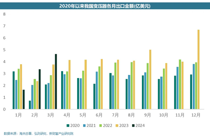 就变压器而言,据海关数据显示,2021-2023年出口金额分别为34.40/42.23/50.29亿美元,同比增长12.02%/22.75%/19.07%,2022年后开启高速增长。同时,就2024年3月的最新数据,单月出口额达到4.66亿美元,同比增长23.47%,