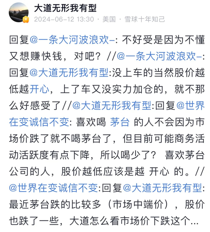 喜欢喝茅台的人不会因为市场价跌了就不喝茅台了,但目前可能商务活动活跃度有点下降,所以喝少了?喜欢茅台公司的人,股价越低应该是越开心的。