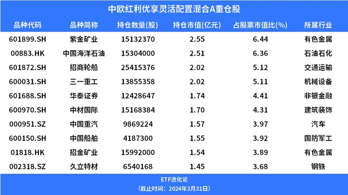 以中欧红利优享A为例,该基金年内收益率18.99%,吸引大量资金申购,使得规模暴增。截至一季度末,该基金重仓了紫金矿业、中国海洋石油、招商轮船、三一重工等公司。