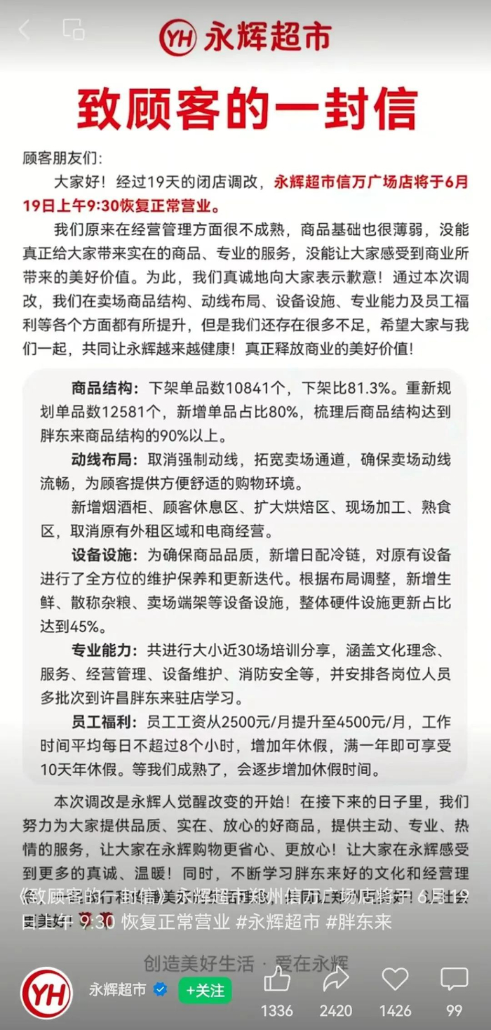 此前永辉超市曾发布《致顾客的一封信》,信中表示经过19天的闭店调改,永辉超市信万广场店将于6月19日上午9:30恢复正常营业。此外信中还透露了改造的细节,商品结构方面,下架单品数10841个,下架比81.3%。重新规划单品数12581个,新增单品占比80%,梳理后商品结构达到胖东来商品结构的90%以上。