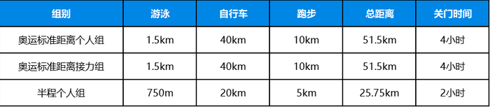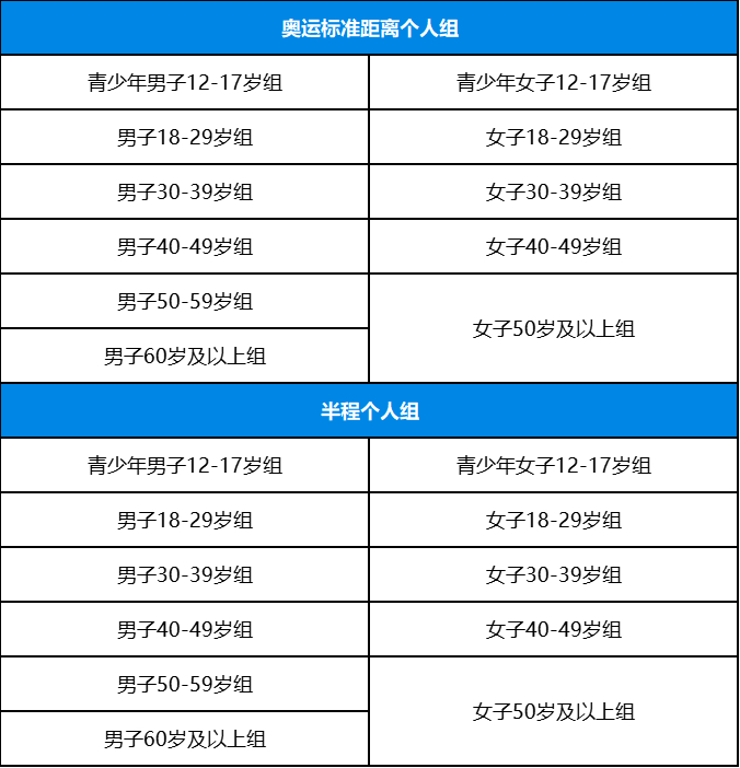 2.奥运标准距离组、半程组分别取男女全场、男女年龄组前三名进行颁奖;奥运标准距离接力组取前三名队伍进行颁奖。