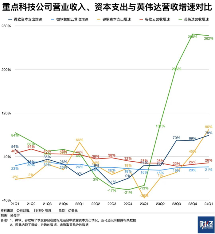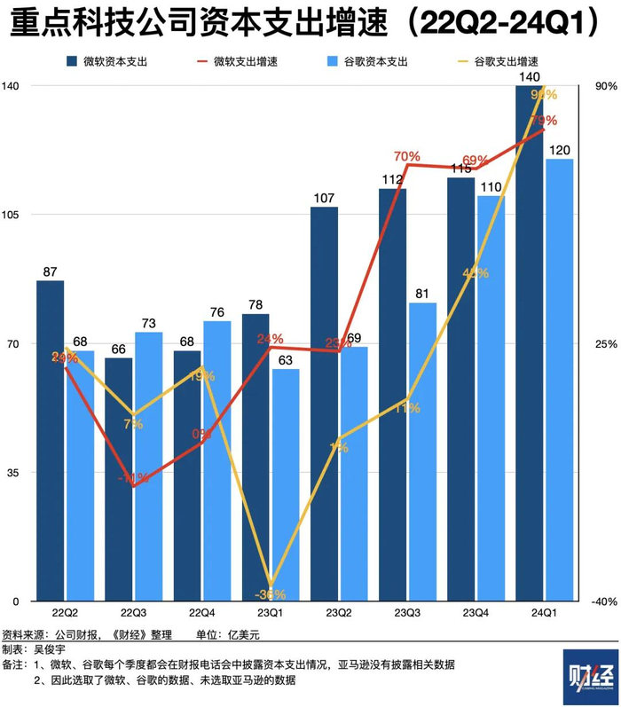 科技公司采购英伟达的AI芯片,付出了高昂的资本支出。微软、谷歌每个季度都会在财报电话会议中披露资本支出情况,亚马逊没有披露相关数据。微软、谷歌近四个季度(2023年二季度-2024年一季度)资本支出平均增速分别是60%、37%。此前四个季度(2022年二季度-2023年一季度),两家公司资本支出平均增速分别仅为8%、4%。