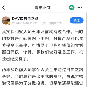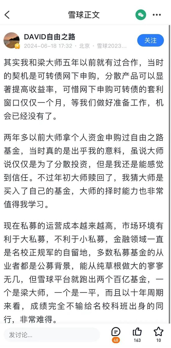 同日,徐大为(即“DAVID自由之路”)也在该平台转发了梁宏的上述动态,并发文表示,5年以前就和梁宏有过合作,当时的契机是可转债网下申购,分散产品可以显著提高收益率,可惜网下申购可转债的套利窗口仅仅1个月,等做好准备工作,机会已经没有了。他还透露,两年多以前梁宏曾拿个人资金申购过自己管理的基金。