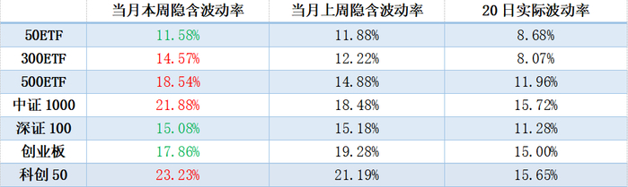 当月本周、上周隐含波动率与20日实际波动率对比如下: